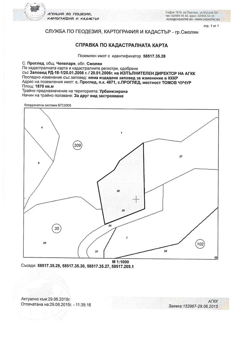ПОЗЕМЛЕН ИМОТ с идентификатор 58517.35.28 по кадастралната карта и кадастралните регистри на с. Проглед, общ. Чепеларе, обл. Смолян, одобрени със Заповед № РД-18-1/20.01.2006 г. на Изпълнителния директор на АГКК, с площ от 1870 кв. м. (хиляда осемстотин и седемдесет квадратни метра), с трайно предназначение на територията: Урбанизирана, с начин на трайно ползване: За друг вид застрояване, находящ се в землището на с. Проглед, ЕКАТТЕ 58517, общ. Чепеларе, обл. Смолян, местност Томов чучур, при граници и съседи на поземления имот по кадастралната карта и кадастралните регистри: поземлени имоти с идентификатори 58517.35.29, 58517.35.30, 58517.35.27, 58517.209.1, който имот представлява УПИ III – База за отдих и който е образуван от поземлен имот с идентификатор 58517.35.12, с площ на целия имот от 10423 кв.м. (десет хиляди четиристотин двадесет и три квадратни метра), съгласно Заповед № 94-В-90/18.04.2006 г. на Кмета на Община Чепеларе.https://zapori.mjs.bg/#/announcements/display/3371